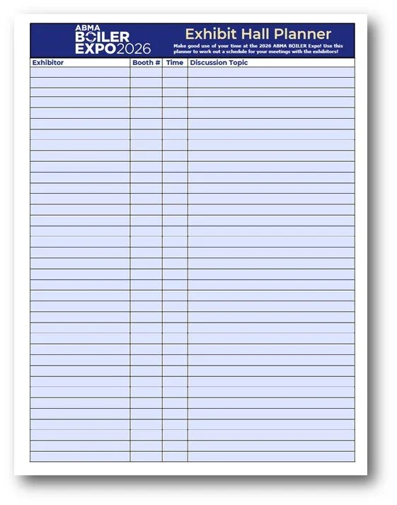 Make good use of your time at the ABMA 2026 BOILER Expo! Use our planner and directory to work out a schedule for your meetings with the exhibitors!